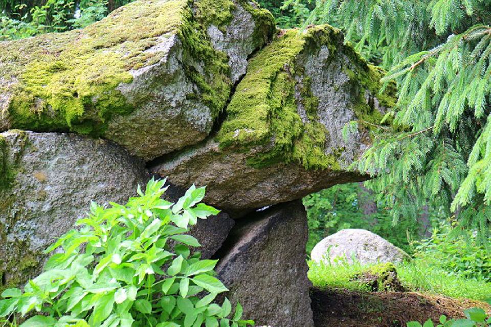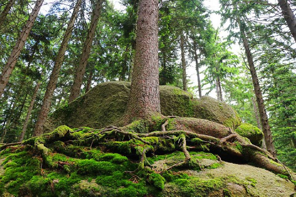 3. Augenstein. In direkter Nachbarschaft versteckt sich zwischen einigen Jungtannen ein riesiger Felsblock. Auf seiner Oberseite entdecken wir zwei fast auf einer Höhe nebeneinander liegende kreisrunde Schalen. Als hätte der Felsen seinen Blick gegen den Himmel gerichtet.