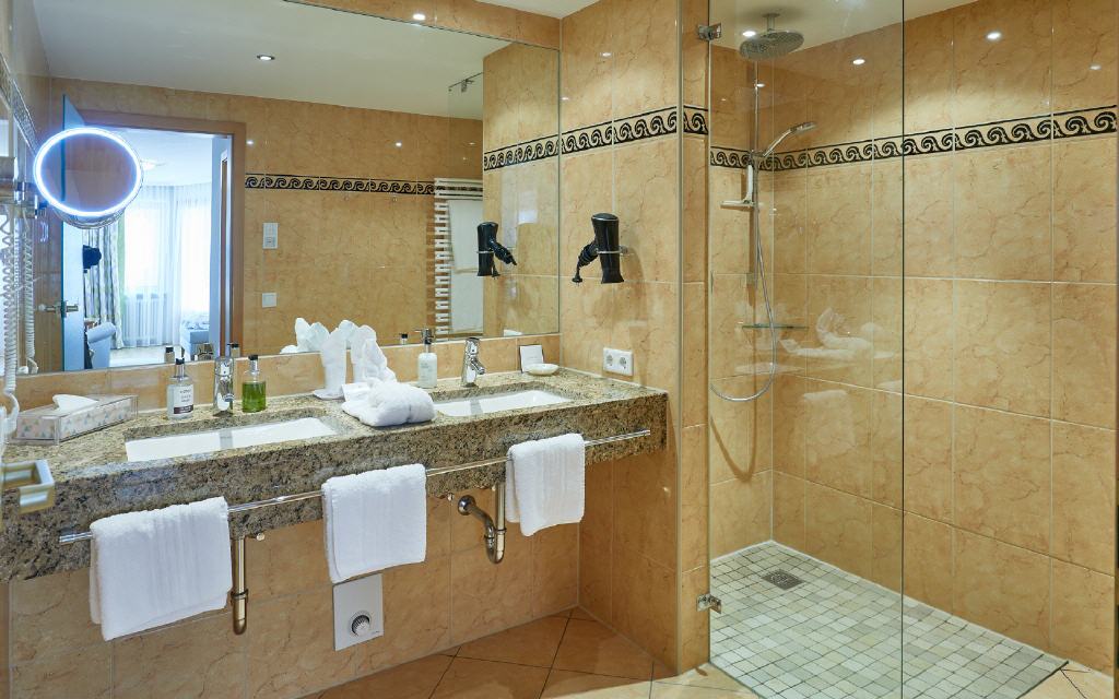 Doppelzimmer Kinzigtal. Doppelzimmer 34 bis 36 qm, Loggia/Balkon 4 bis 8qm, Waldseite mit Morgensonne. Unvergessliche Urlaubsmomente garantiert: Wenn die Morgensonne durch den Schwarzwald blinzelt und durch das geräumige Doppelzimmer flutet, steht einem perfekten Ferientag nichts mehr im Weg. Der elegante Stil – akzentuiert mit traditionellen Elementen – sorgt für höchsten Wohnkomfort. Besonderes Ausstattungsmerkmal: separate Toilette und teilweise begehbare Ankleiden.